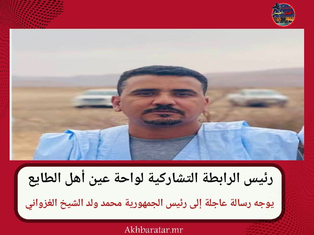 -أخبار (أطار)- وجه رئيس الرابطة التشاركية لواحة عين أهل الطايع السيد بوها الفيل رسالة عاجلة إلى رئيس الجمهورية السيد محمد ولد الشيخ الغزواني تحت عنوان: صرخة نجدة من مزارعي النخيل.