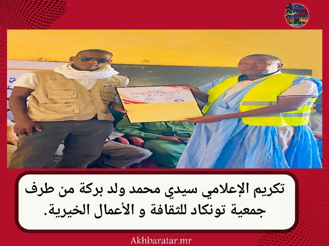 -أخبار (أطار)- كرّم رئيس جمعية تونكاد للثقافة و الأعمال الخيرية السيد سيدي أحمد ولد صمب ، المدون و الإعلامي و الوجه الشبابي البارز في مقاطعة أوجفت؛ سيدي محمد ولد بركة، و ذلك تتويجا لجهوده الكبيرة في إيصال صوت المواطن الأوجفتي المطحون.