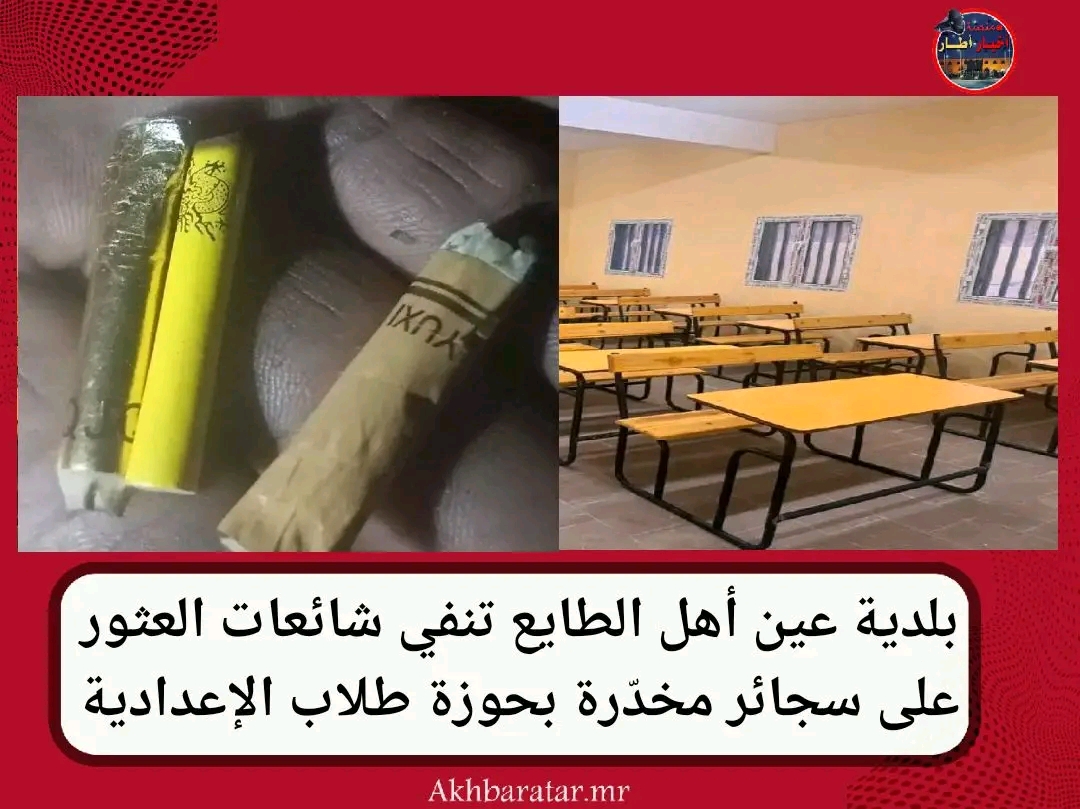-أخبار (أطار)- نفى عمدة بلدية عين أهل الطايع محمد ولد أعل ولد شينون صحة ما تم تداوله على بعض وسائط التواصل الاجتماعي حول العثور على سجائر مخدّرة في جيوب بعض من طلاب الإعدادية.