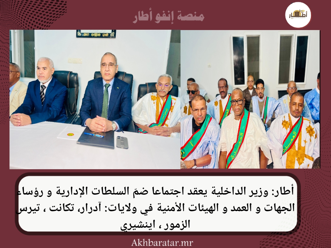 -أخبار (أطار)- عقد وزير الداخلية و ترقية اللامركزية و التنمية المحلية السيد محمد أحمد ولد محمد الأمين، مساء الأمس الإثنين بمدينة آطار اجتماعا ضم السلطات الإدارية و رؤساء الجهات و العمد و الهيئات الأمنية في ولايات: آدرار، تكانت، تيرس زمور و إينشيري.