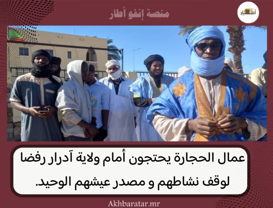 -أخبار (أطار)- نظم عدد من عمال مقالع الحجارة، صباح اليوم، وقفة احتجاجية أمام مباني ولاية آدرار، تنديدا بما وصفوه بقطع أرزاقهم من قبل وزارة المعادن، بعد قرارها إيقاف أنشطتهم دون سابق إنذار أو تقديم مبررات واضحة.