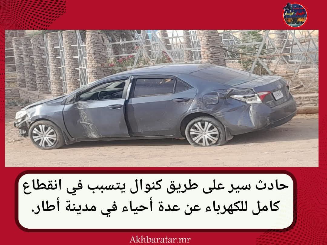 -أخبار (أطار)- تسبب حادث سير وقع في ساعات متأخرة من ليلة البارحة على طريق كنوال في انقطاع شامل للكهرباء عن عدة أحياء في المدينة، وذلك بعد اصطدام سيارة بعمود كهربائي.