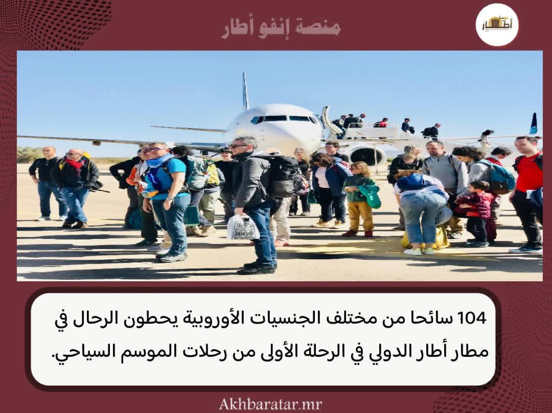 وكان على متن الرحلة، 102 سائحا من مختلف الجنسيات الأوروبية، بحسب مدير المكتب الوطني للسياحة بولايةآدرار، السيد: الشيخ ماء العينين ولد الشيخ سعد بوه وتعد هذه الرحلة الأولى من أصل (12) رحلة مبرمجة ، وستصل بقية الرحلات تباعا إلى مطار أطار كل يوم سبت طيلة أسابيع الموسم السياحي. #أخبار_أطار