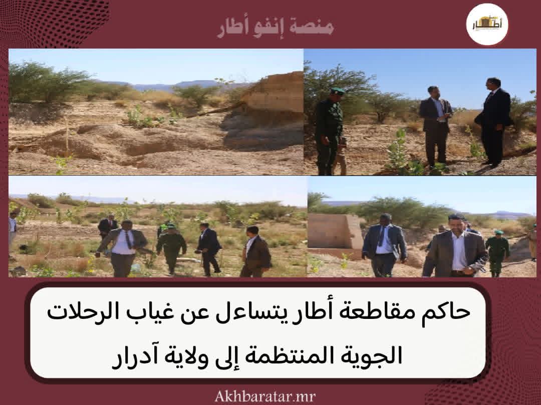 -أخبار (أطار)- تساءل حاكم مقاطعة أطار، خلال افتتاح موسم السياحة، عن الأسباب التي تقف وراء غياب الرحلات الجوية المنتظمة، سواء الأسبوعية أو الشهرية، إلى ولاية آدرار، رغم تصنيفها كولاية سياحية، وذلك على خلاف ما هو معمول به في مدينتي نواذيبو وأزويرات.