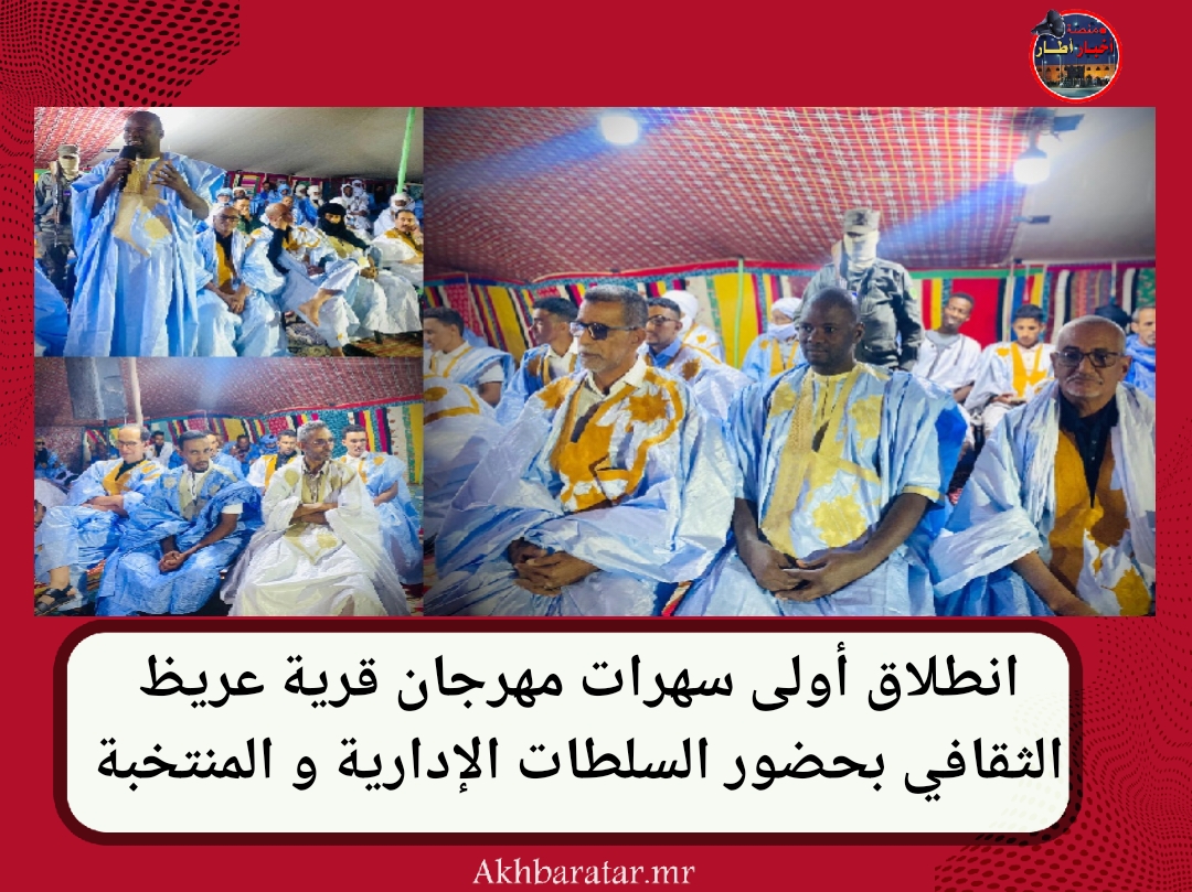 -أخبار (أطار)- شهدت قرية عريظ التابعة لبلدية العين الصفرة، ليلة البارحة، الانطلاقة الرسمية لفعاليات مهرجان عريظ الثقافي المنظم من طرف شباب القرية، و ذلك بحضور حاكم مقاطعة شنقيط و عمدة بلدية العين الصفرة وعدد من الشخصيات الثقافية و الاجتماعية.