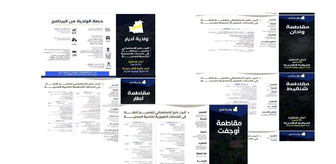 أُعلن عن حصة ولاية آدرار من البرنامج الاستعجالي للنفاذ إلى الخدمات الأساسية بقيمة 13 مليار أوقية قديمة، تضمنت جملةً من المشاريع التنموية شملت إنشاء 261 حجرة دراسية، و3 نقاط صحية، وتوفير 5 سيارات إسعاف، وحفر 60 بئراً، إضافةً إلى تزويد المنطقة بـ4 مولدات كهربائية وكهربة 9 قرى.