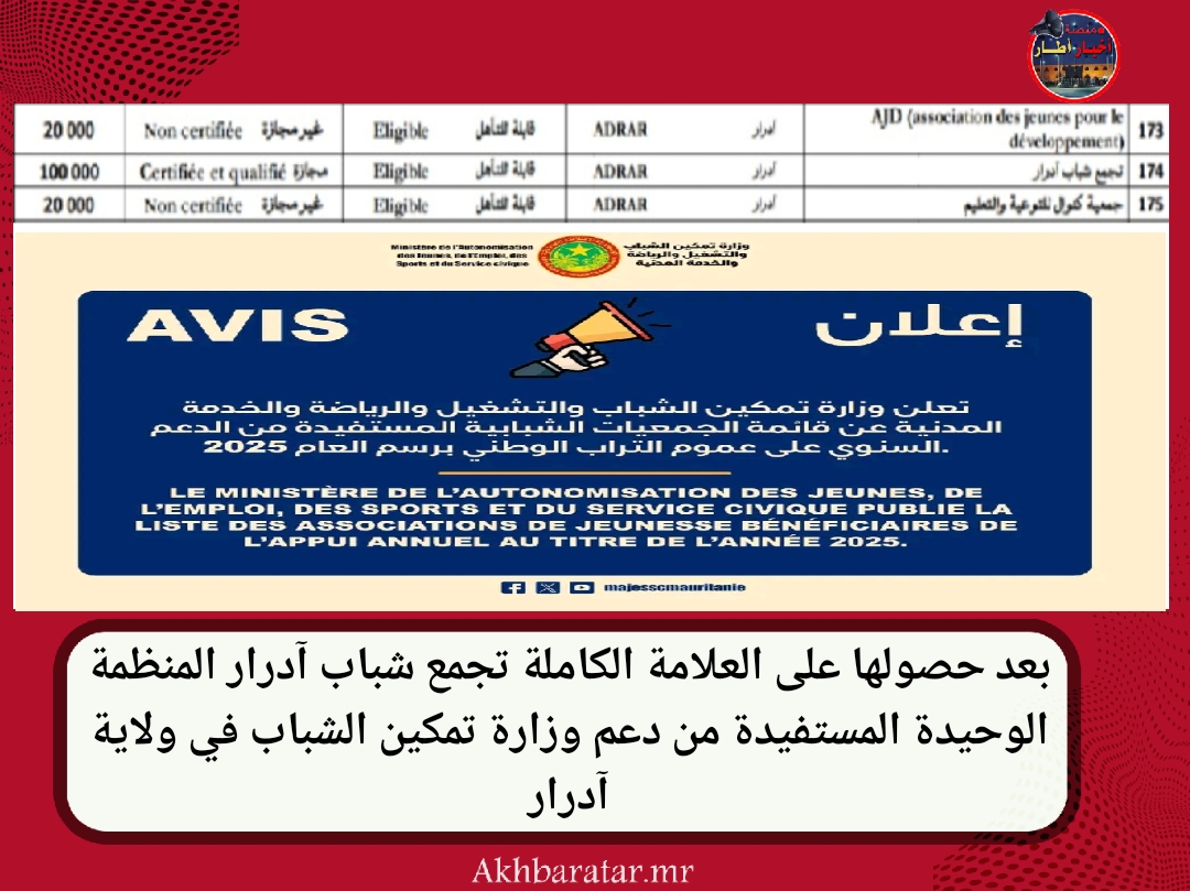 -أخبار (أطار)- أعلنت وزارة تمكين الشباب اليوم قائمة الجمعيات الشبابية المستفيدة من الدعم السنوي، و أظهرت القائمة منظمة تجمع شباب آدرار كونها المنظمة الوحيدة في ولاية آدرار التي ستستفيد من الدعم السنوي ، بعد أن استوفت جميع الشروط المطلوبة وحصلت على العلامة الكاملة في عملية التقييم.
