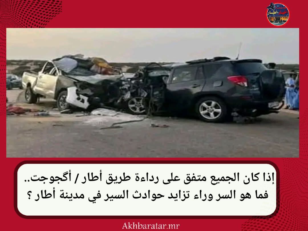 -أخبار (أطار)- شهدت مدينة أطار خلال الأسابيع الأخيرة ارتفاعا ملحوظا في حوادث السير، بعضها أسفر عن إصابات متفاوتة الخطورة و وفيات، ما أثار موجة من القلق و دفع بعض النشطاء إلى تجديد مطالبهم بترميم الشبكة الطرقية داخل المدينة والطريق الرابط بينها و بين أكجوجت.