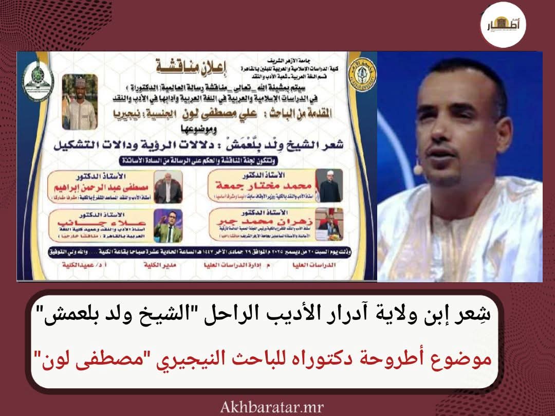-أخبار (أطار)- في حدث أكاديمي مميز، سيتم في العشرون من الشهر الجاري في العاصمة المصرية القاهرة، نقاش أطروحة دكتوراه بعنوان "شعر الشيخ ولد بلعمش: دلالات الرؤية ودلالات التشكيل"، وذلك من قبل الباحث والشاعر النيجيري الكبير علي مصطفى لون.