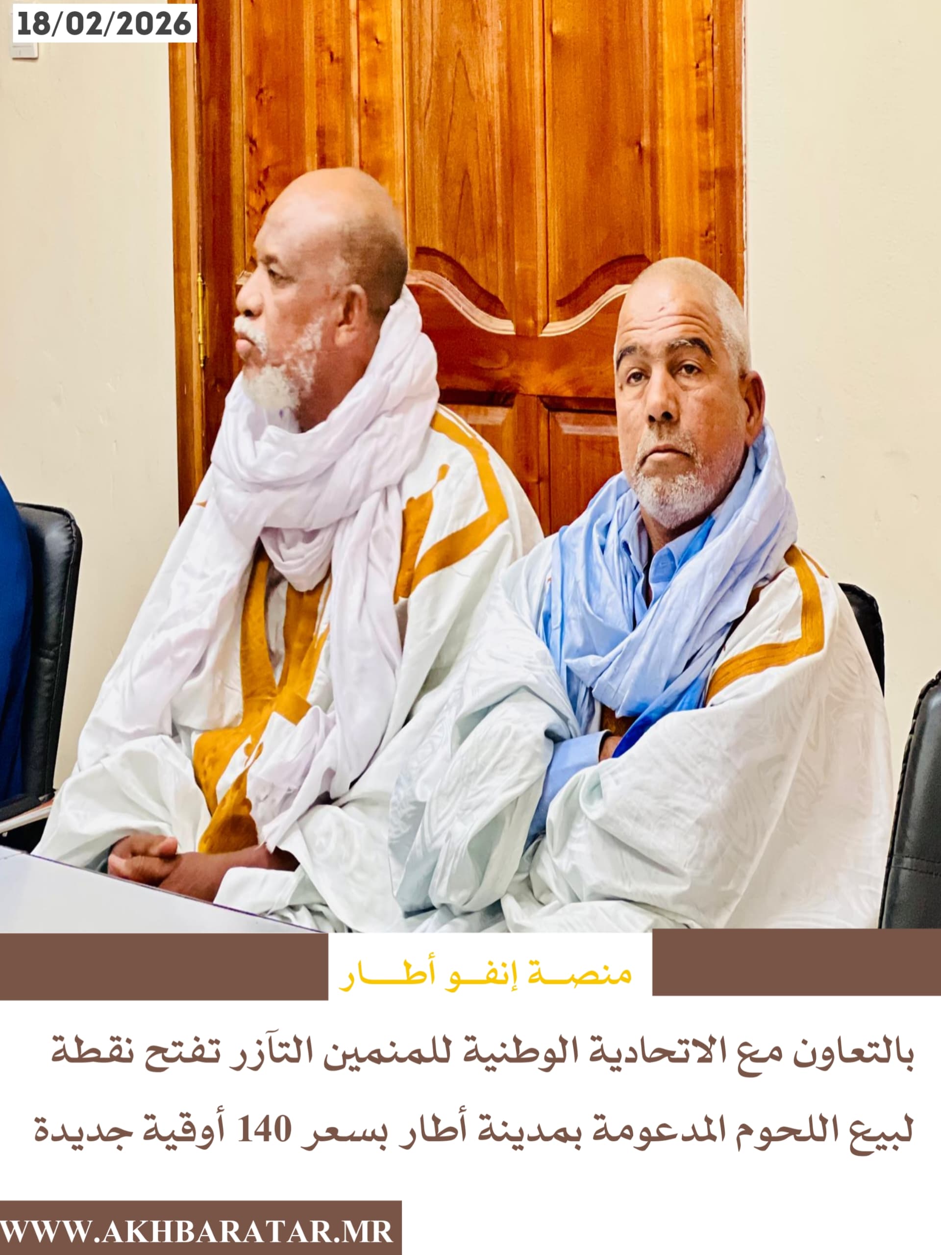 -أخبار (أطار)- أعلنت الاتحادية الوطنية للمنمين، بالتعاون مع المندوبية العامة للتضامن الوطني ومكافحة الإقصاء (تآزر)، عن افتتاح نقطة لبيع اللحوم المدعومة في جميع ولايات الوطن ، و ستكون نقطة البيع في مدينة أطار، بمباني مفوضية الأمن الغذائي.
