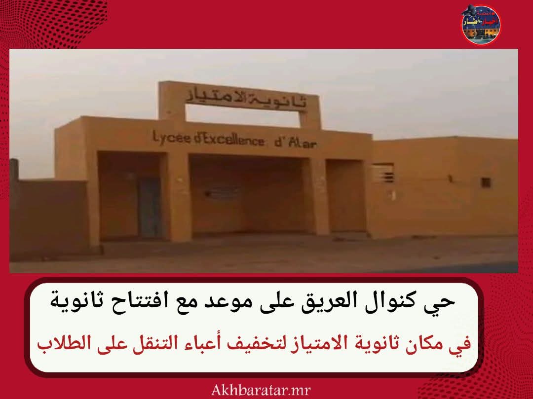 -أخبار (أطار)- في إطار الجهود الرامية إلى تخفيف أزمة التنقل على الطلاب في أحياء " ارگيبة، تينيري ، كنوال ، تويرسات" أكد مصدر ل أخبار أطار أن الإدارة الجهوية للتهذيب بولاية آدرار تتجه إلى دراسة إمكانية افتتاح ثانوية جديدة في مكان ثانوية الامتياز بحي كنوال، التي صدر قبل أيام قرار بإغلاقها، و ذلك تماشيا مع البنية التربوية لثانويات الامتياز في العام الدراسي الجديد.