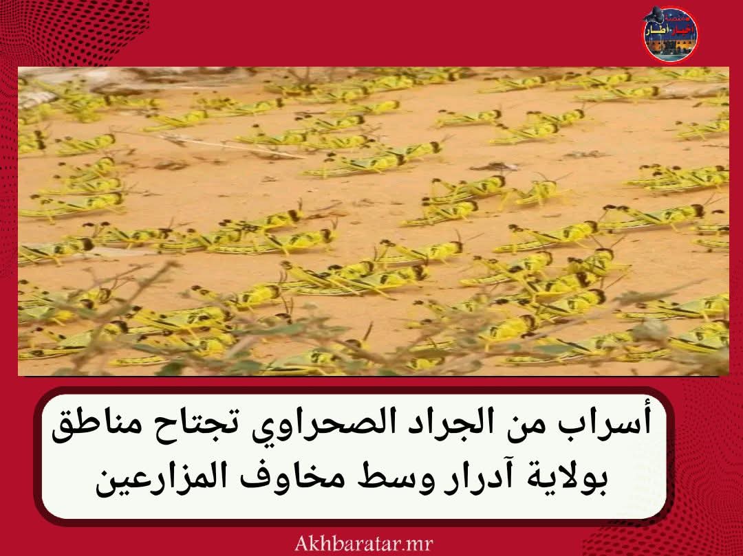 -أخبار (أطار)- اجتاحت أسراب من الجراد الصحراوي خلال الساعات الماضية مناطق متفرقة من ولاية آدرار، ما أثار مخاوف المزارعين من تأثيرها على المحاصيل الزراعية قبيل موسم الحصاد.