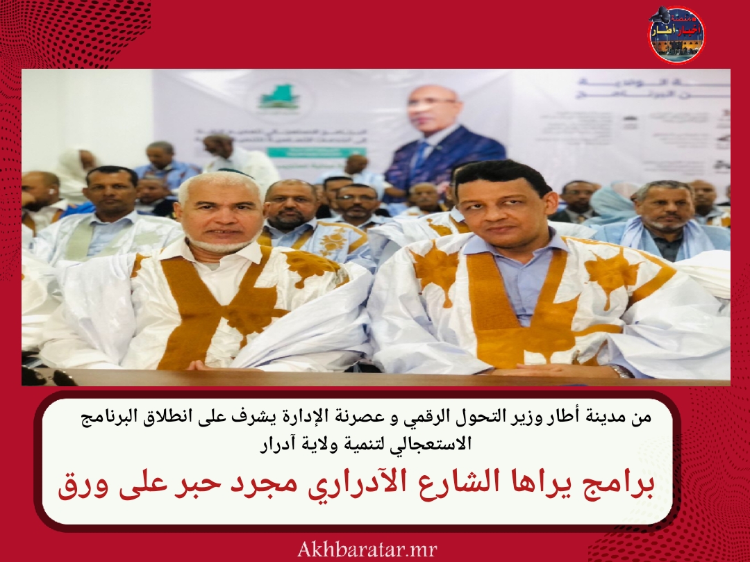 -أخبار (أطار)- أشرف وزير التحول الرقمي و عصرنة الإدارة صباح اليوم من مباني جهة آدرار على إطلاق البرنامج الاستعجالي لتنمية ولاية آدرار، في خطوة جديدة تحمل وعودا بتنمية الولاية و تحسين ظروف الساكنة.
