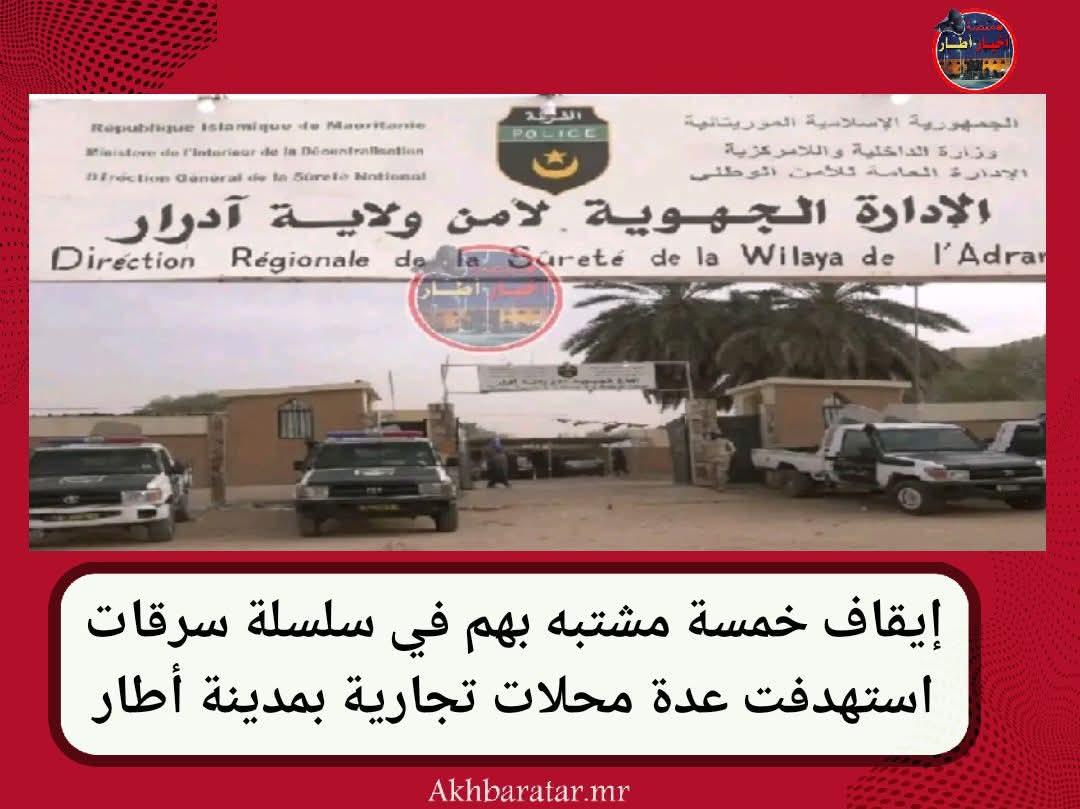 -أخبار (أطار)- أوقفت مفوضية الشرطة في مدينة أطار خمسة قُصر يشتبه في تورطهم في تنفيذ سلسلة من السرقات التي طالت عددا من المحلات التجارية في بعض أحياء المدينة، وكان حي اكويكه الأكثر تضررا منها.