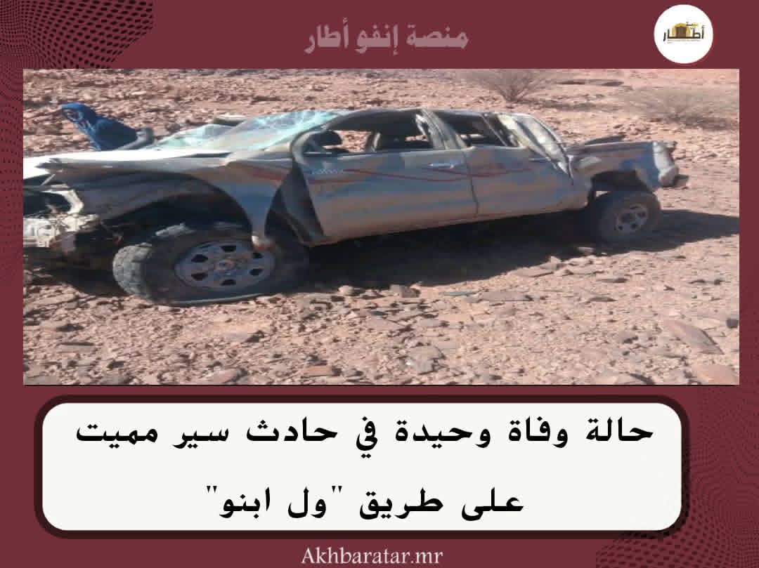 -أخبار (أطار)- وقع صباح اليوم حادث سير على طريق شنقيط، وتحديدا في الممر الجبلي المعروف محليا بطريق ولد ابنو، أسفر عن وفاة سائق السيارة، الذي كان بمفرده داخلها.