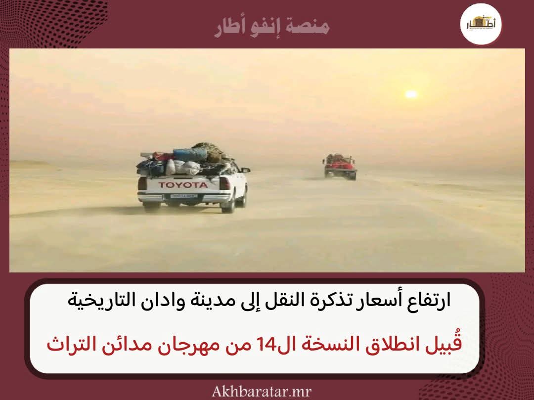 -أخبار (أطار)- شهدت أسعار تذاكر النقل إلى مدينة وادان التاريخية ارتفاعا لافتا خلال الأيام الأخيرة، حيث وصل سعر التذكرة الواحدة إلى 8 آلاف أوقية قديمة، مع مؤشرات على إمكانية زيادتها في أي وقت، في ظل ما يصفه المواطنون بالمضاربة الواضحة واستغلال الظرف من طرف بعض أصحاب السيارات.